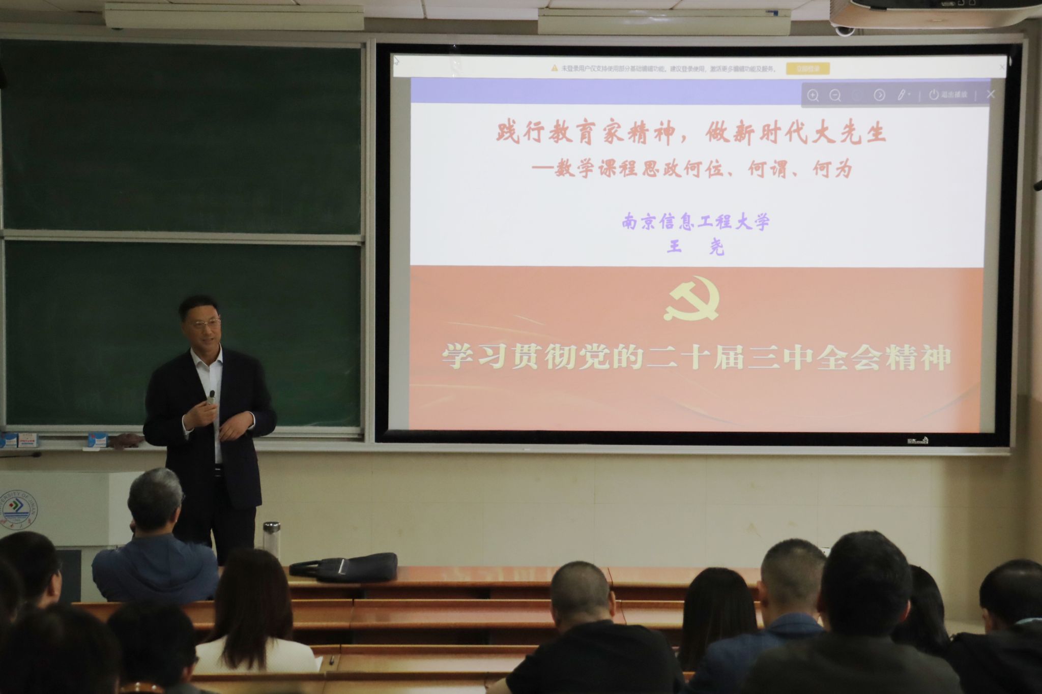 为贯彻落实立德树人根本任务,深入推动我院“课程思政”建设走深走实,全面提升人才培养质量,5月6日下午,南京信息工程大学原党委副书记、副校长,博士生导师王尧教授来院为师生作题为“弘扬教育家精神,做新时代大先生——数学课程思政何位、何谓、何为”的专题报告。学院全体领导班子成员及全体教职工参加会议,会议由学院党委书记崔英静主持。