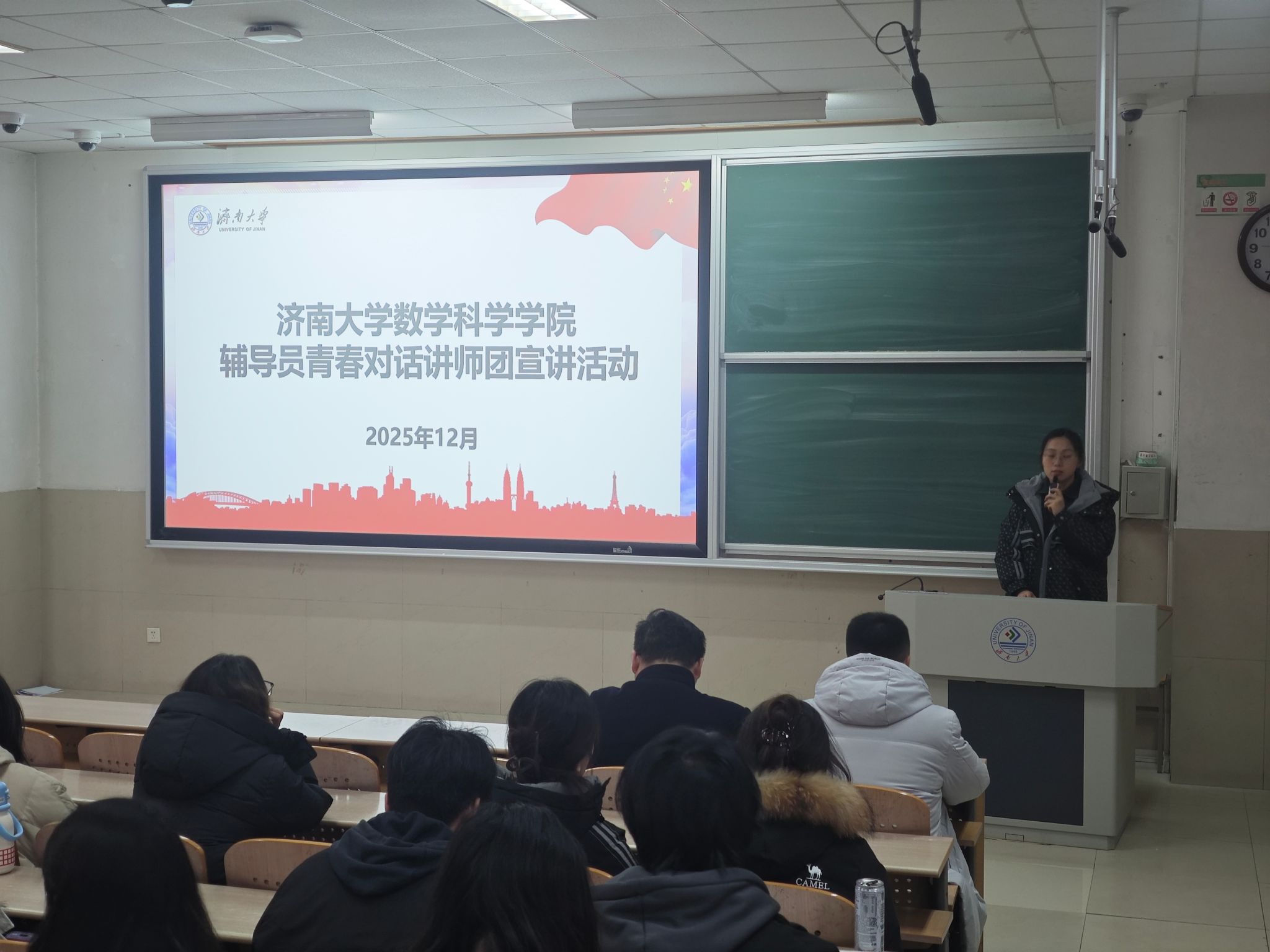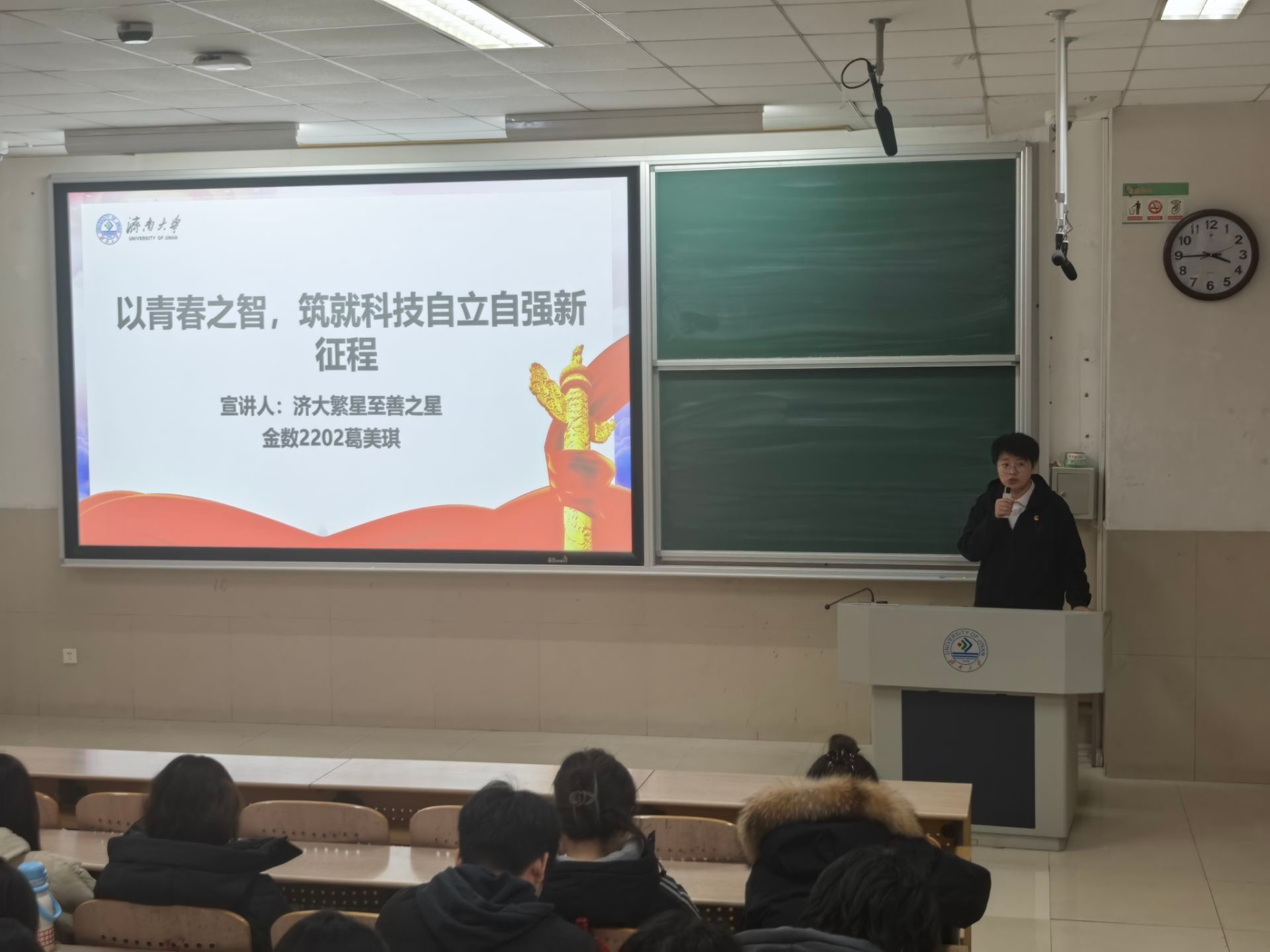 学生工作办公室主任房琳琳、济南大学第九届“济大繁星”获得者葛美琪应邀进行宣讲。各年级学生党员及主要学生干部参加学习活动。