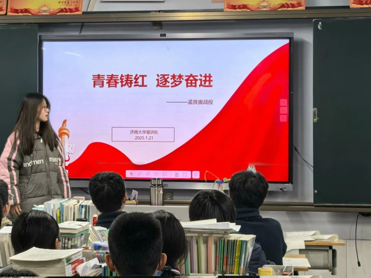 在活动中,实践队成员重返校园,讲述革命战役的峥嵘岁月、英雄事迹和革命精神。其中,金数2402孙越玲讲述孟固良战役的背景、过程和影响。她指出,该战役粉碎了国民党军“鲁中决战”计划,重挫了国民党军对山东地区“重点进攻”的战略,对解放战争的进程产生了重大影响。而数学2404宋燕飞则详细介绍孟固良战役中的英雄人物,她提到,粟裕同志和陈毅同志密切合作,共同指挥野战军,为歼灭国民党军、解放全中国立下了汗马功劳。在宣讲过程中,听众们深受触动并对革命先烈表达由衷的敬佩。