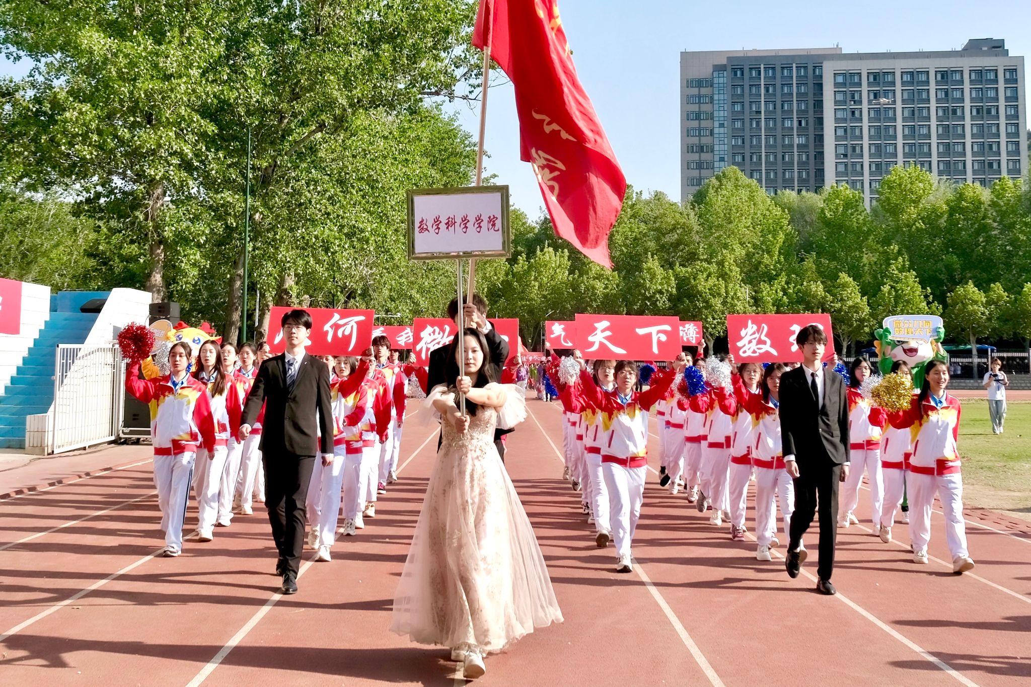 师生方阵迎着四月暖阳,步履铿锵、朝气蓬勃。他们手持“数理天下,微分几何,看我数院,气势磅礴”的创意展板,将严谨的学科精神与蓬勃的运动活力完美融合,展现了数学人锐意进取的精神风貌。