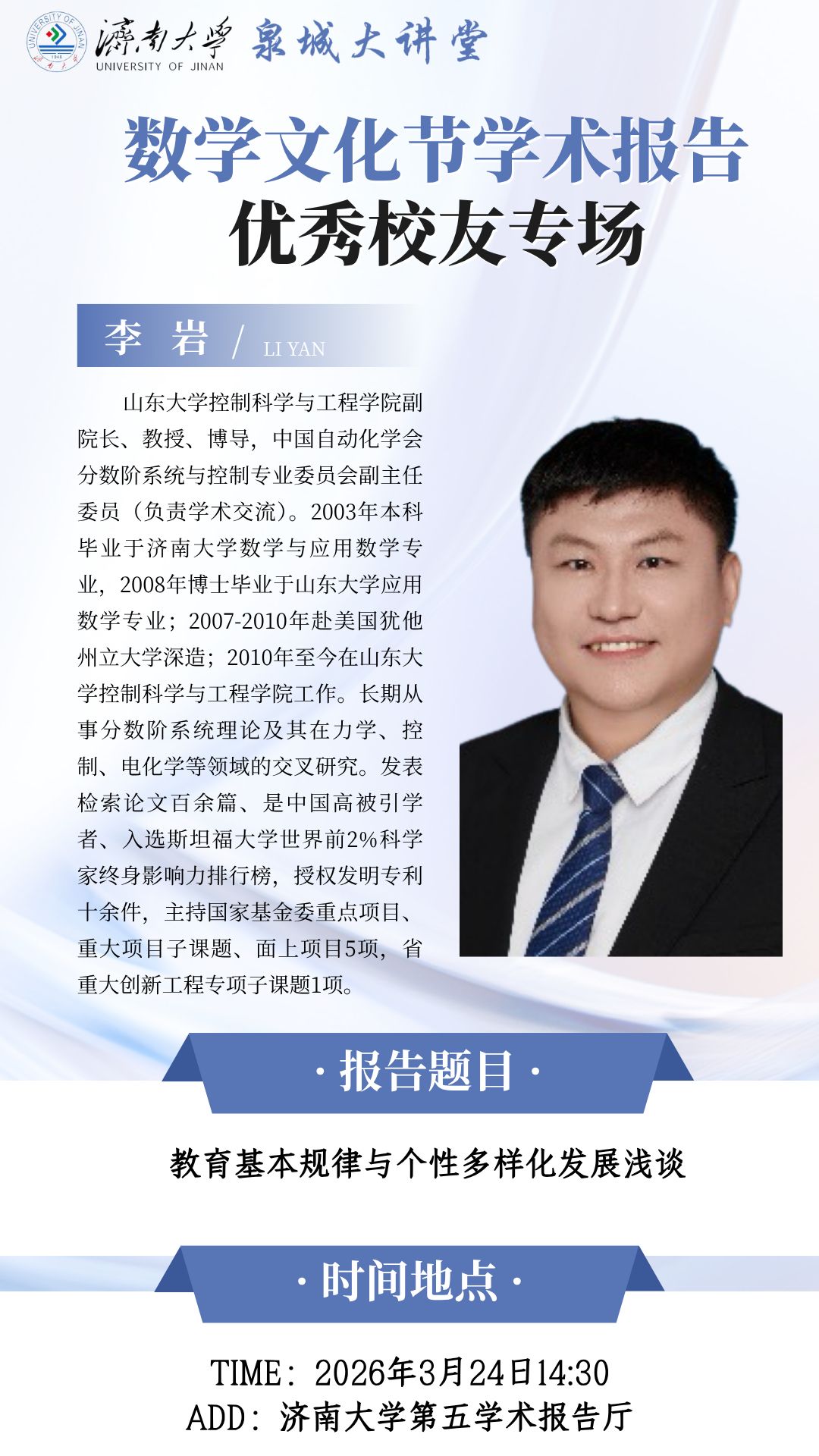 泉城大讲堂·济南大学第二届数学文化节学术报告:教育基本规律与个性多样化发展浅谈